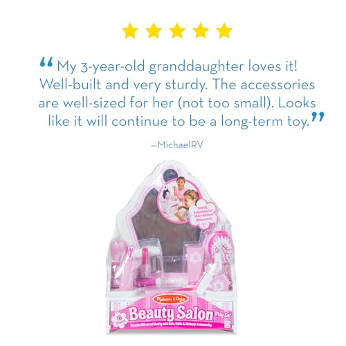 - Imaginative Salon Play: Kids role play as stylists, using pretend tools to brush hair & apply “makeup” for endless pretend play that sparks creativity & role-playing fun every day (Not real makeup), 18-Piece Set: Includes wooden toys like a vanity with kid-friendly mirror & storage drawer, plus hair dryer, straightener, comb, brush, flip-top lotion bottle, & pretend makeup like lipstick & nail polish, Open-Ended, Screen-Free Play: Builds empathy, communication & problem-solving through preschool learning activities that encourage creativity, confidence & social interaction through pretend play, Educational Toys for Any Occasion: When buying a birthday gift & holiday gifts for kids, or rewarding little milestones, celebrate the moments that matter with Melissa and Doug toys for boys & girls, Wholesome Play for 35+ Years: Melissa & Doug inspires kid-powered play with its learning toys for kids, baby & toddler toys, puzzles, games, building toys & stuffed animals, dolls, & even a doll house