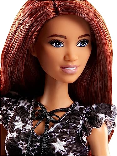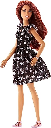 - Barbie Fashionistas doll "sees stars" in a black dress with white starry print and ruffled sleeves, Pink shoes and a bangle complete the look., Her wavy, red hair is right on trend, More variety makes collecting Barbie Fashionistas dolls even more fun. Collect them all (each sold separately, subject to availability), Clothing is designed to mix and match with dolls of the same body type
