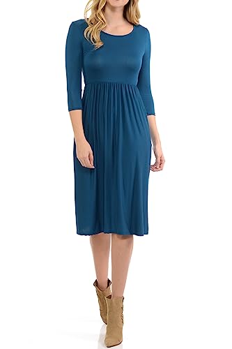 - This cute dress features three quarter sleeves, rounded neckline, midi length, concealed side pockets and flared skirt. It is made with soft jersey knit that has great stretch., Solid Colors: 95% Rayon, 5% Spandex., Floral Prints: 92% Polyester, 8% Spandex., Model is wearing size Small. Fit true to size., Hand wash cold or dry clean. Do not bleach. Hang to dry.