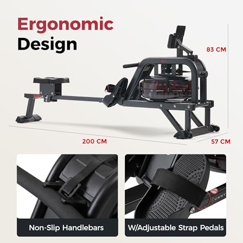 - 【WATER PERFORMANCE】Row on the water in the comfort of your home. The water creates a smooth and steady rowing experience with every stroke. Instant resistance is available with the flywheel and 16 fan blades. The faster the fan blades spin the higher resistance and dynamic response caused by the harmonious interaction with the water, giving the user a unique experience., 【DESIGN】Constructed with LIGHTWEIGHT sturdy steel, for solid performance and durability. The 16 Hydro Blades mimic the dynamic movements of competitive rowing. Non- slip HD Handlebar is sweat-resistant and wide enough to accommodate different hand widths. A tear-resistant mesh belt withstands the stress of repeated pulling. Keep the rower sturdy and level with the adjustable leveling end caps., 【ERGO-EFFICIENT】Molded padded seat is designed to be comfortable and functional. The high-profile seat design is 44cm from the ground, which allows user to get on and off the seat without bending and straining you back. Non-slip foot pedals with durable nylon Velcro straps keep feet secure. Footpads pivot to allow more freedom of the foot and ankle to ensure optimal rowing mechanics., 【FITNESS TECHNOLOGY】The R2 Fitness Meter is designed to accurately track all essential workout metrics i.e. Total Time, 500 m Time, SPM, Total Strokes, Calories, HR, Ambient Temperature, and more. R2 Fitness Meter allows the user to tailor a personalized workout or use the built preprogrammed features. Wireless connection with a compatible heart rate strap., 【EASY STORAGE】High-density non-marking rubber wheels perfect for easy transport and store upright when not in use. Recommended to be placed upright against the wall for storage., 【ANT + HEART RATE BELT COMPATIBILITY】Compatible with ANT+ heart rate technology, like heart rate belts or watches, so you can measure an accurate pulse and monitor the effectiveness of your workout. When worn around your chest during your exercise routine, the pulse belt will transmit your heart rate to the advanced digital monitor. Heart rate belt sold separately., 【FREE SUNNYFIT APP】Enjoy FREE access to the SunnyFit App with every Sunny Health & Fitness product no membership fees! Dive into 1,000+ trainer-led workouts, explore 10,000+ virtual scenic tours, track your progress, challenge others, & much more!, 【EST. IN SUNNY CALIFORNIA SINCE 2002】Sunny Health & Fitness delivers premium equipment with a commitment to quality. Backed by U.S.-based support and certified trainers, we offer a truly unmatched “Fit for Everyone” experience.