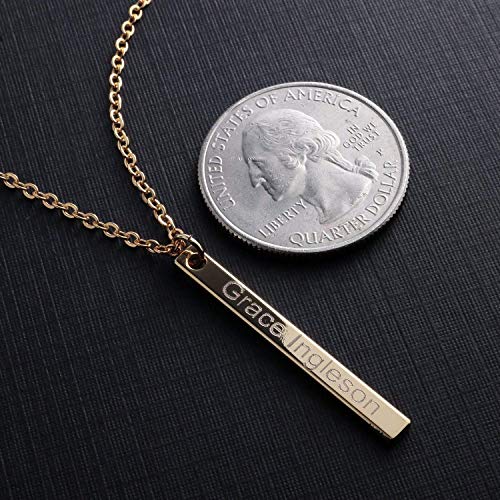 - Personalized Elegance: Engrave the vertical bar pendant with your chosen name, creating a unique and personalized accessory that reflects your identity and adds a touch of sophistication to your look., Vertical Bar Design: The vertical bar pendant design adds a modern and sleek touch to your neckline, making it a versatile piece suitable for various styles and occasions., Gift-Ready Packaging: Presented in an elegant gift pouch, the Your Name Vertical Bar Personalized Necklace is perfect for gifting on birthdays, anniversaries, and special moments., Versatile Styling: Whether worn solo or layered with other necklaces, this piece effortlessly complements your look and adds a touch of personalized charm.