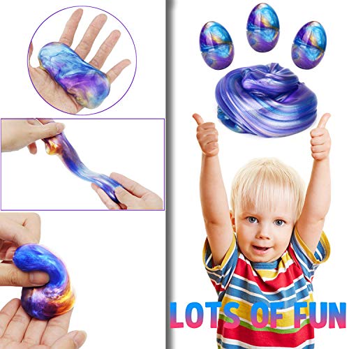 - ⭐【Easter Egg Slime】Our Easter eggs are galaxy slime kits for kids, girls, boys and adults. Can be used as Easter basket stuffers, kids birthday party favours, stocking stuffers and loot bag fillers. Butter slime works on boys' and girls' co-ordination skills and develops their creativity and imagination., ⭐【High Quality Slime】This silly putty for kids is made from natural resins, water and inorganic powders, feel free to play with it, but don't eat it! This 3 pack egg slime kit is a mixture of blue and purple with a soft, smooth, flexible texture that won't stick to your hands or walls and is easy to clean up., ⭐【Stress Relieving Educational】Our galaxy slime kit for girls and boys is a wonderful sensory toy, kids can squeeze and stretch to release the pressure, our butter slime kit won't break easily, it can bring infinite fun, and also stimulate children's imagination and creativity, it's the best choice for surprise gifts for kids., ⭐【Great for Kids Slime DIY】kids can make all sorts of things with galaxy slime like animals, flowers, trees and more. It is the perfect early learning toy by stimulating children's imagination to create art, learn and gain a sense of achievement while playing., ⭐【Slime Party Favors for Kids】Our Easter egg slime galaxy kit is a simple, non-electronic, fun stress relieving game for kids of all ages, perfect as a creative toy for parent-child activities and classmates' parties, and a slime surprise gift for New Year's, birthday, and Easter gifts for kids.
