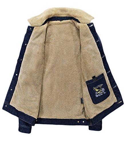 - Fabric: 65% Cotton 35% Polyester; Lining: 100% Polyester, The inner soft fleece can keep your body warm and comfortable during cold days., Basic turn down collar, front button down closure, long sleeve with button cuff. 2 side entry pockets, 2 chest flap pockets and 1 interior pocket., High quality light washed and distressed cotton denim fabric, which is suitable for casual daily wear., Machine wash normal cycle.