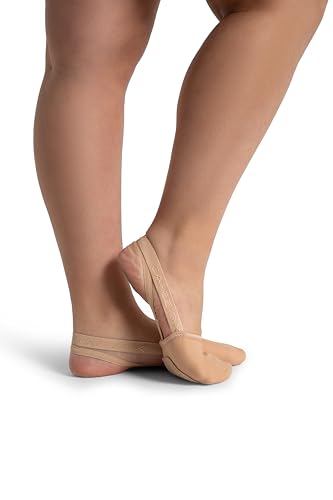 - Women begin with street shoe size. Men begin 2 sizes up. Wide widths and 1/2 sizes are encouraged to size up from street shoe size., XS (1-2), S (3-6), M (7-8), L (9-10), XL (11-12), XXL (13-14), 4 way stretch canvas, Suede sole patches, Extremely flat pleats, Micro fiber lining, One sided plush primary elastic with Capezio logo and secondary silicone lined elastic for secure fit around heel
