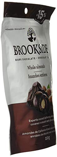 - One 210g bag of BROOKSIDE Dark Chocolate Whole Almonds, Expertly roasted whole California almonds covered in dark chocolate. Treat yourself to this perfectly crafted pairing, only from BROOKSIDE, Perfect for pairing with wine, on-the-go snacking or enjoying as an evening treat, Resealable pouch keeps this delicious premium chocolate fresh, Made in Canada with domestic and imported ingredients. Gluten Free. Contains no artificial flavours