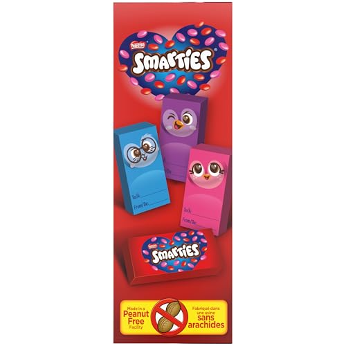 - candy-coated milk chocolate in red & pink for valentine’s, perfectly portioned, with space to write message, smarties are made with natural flavours, no artificial colours, and in a peanut free facility, 45 calories/10 g serving, 100% sustainably sourced cocoa certified by utz, nestlé cocoa plan