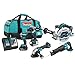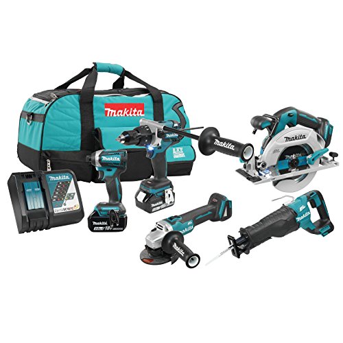 - 1/2" Cordless Hammer Drill / Driver with Brushless Motor (DHP481Z), 1/4" Cordless Impact Driver with Brushless Motor (DTD154Z), 5" Cordless Angle Grinder with Brushless Motor (DGA504Z), 6-1/2" Cordless Circular Saw with Brushless Motor (DHS680Z), Cordless Reciprocating Saw with Brushless Motor (DJR187Z), Two 18V (5.0 Ah) Li-Ion Batteries BL1850B (196675-2), Rapid Charger (DC18RC)