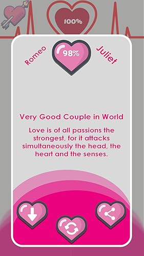 - Feature of Love Calculator :, * Easy and simple to install and use(User Friendly)., * Love Test Shows how much love between couple., * Love Test also provide love understating with message., * Love Test provides share result of love Test to friends., * Easy to share your love result via social media., "The best love is the kind that awakens the soul; that makes us reach for more, that plants the fire in our hearts and brings peace