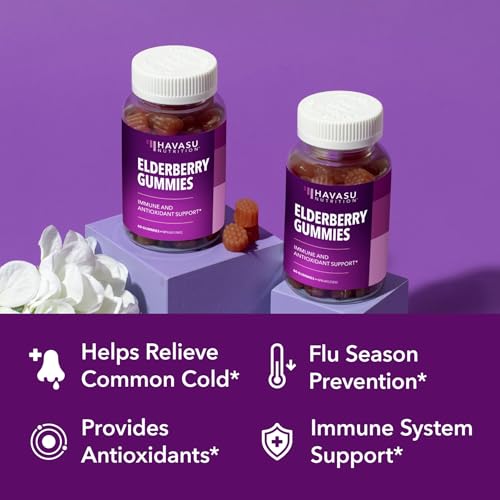 - COLD & FLU RELIEF: Elderberry is a renowned herbal treatment for cold and flu symptoms. At the first sign of cold and flu, elderberry helps reduce fever, cough, mucus buildup and sore throat.*, SAMBUCUS ELDERBERRY GUMMIES: Elderberry immune support gummies contain 100mg of real European Elderberry extract. Elderberry syrup is packed with antioxidant flavonoids with deep immune support properties.*, POWERFUL ANTIOXIDANTS: As an ancient superfood, Elderberry is packed with antioxidants. Antioxidants help protect your cellular health and fight off free radicals to reduce inflammation.*, FULL BODY SUPPORT: Our powerful 3-in-1 formula features Elderberry, Zinc and Vitamin C. These immunity gummies support healthy hair, skin, nails, and bones, promote healthier, stronger teeth, and can even help heal wounds.*, OUR COMMITMENT TO QUALITY: Havasu Nutrition’s Elderberry Gummies Adult are made to the highest quality standards, third-party tested, and formulated Vegan, Non-GMO, and Gluten-Free.