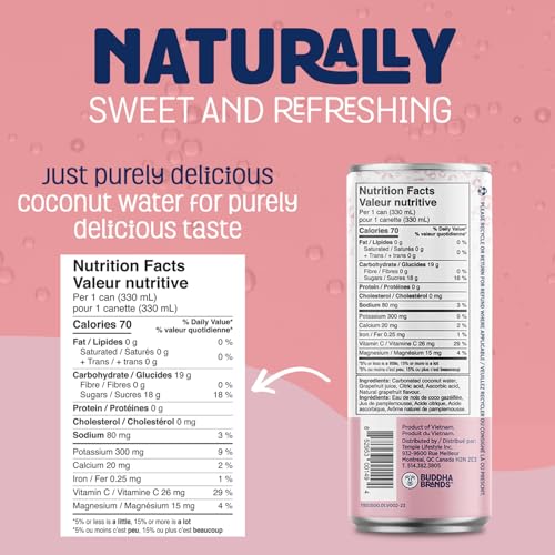 - Naturally Sparkling Hydration: Thirsty Buddha Sparkling Coconut Water is infused with nature’s electrolytes; potassium, calcium, and magnesium, delivering a fizzy, refreshing boost wherever you go; Pure hydration with a sparkling twist, Zero Added Sugar, All Refreshment: Craving a fizzy coconut water without the sugar? Thirsty Buddha’s sparkling coconut water has zero added sugar, giving you all the hydration and none of the extra calories, with a delightful natural fruit flavour, Sourced for Superior Taste: We source high-quality coconuts from family farms in Southeast Asia for our Thirsty Buddha coconut waters; Naturally infused with a touch of fruit flavour for a deliciously clean and fizzy taste, Versatile & Refreshing: Whether you enjoy it straight from the bottle, pour it into a glass of ice, or mix it into mocktails, or cocktails, our sparkling coconut water is a great hydrating and effervescent refreshment for any occasion, Nutrient-Rich & Refreshing: With B-vitamins, electrolytes, and the added effervescence, Thirsty Buddha Sparkling Coconut Water is more than just a drink, it’s a nutrient-packed, naturally flavored refresher that helps fuel your healthy lifestyle with every bubbly sip