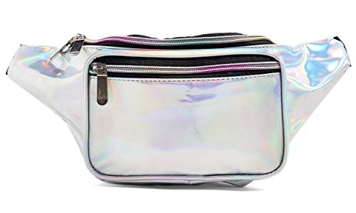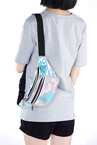 - BAG SIZE: 12"×5"×3.5"(L×H×W). It fits up to a 42” waist,PLEASE NOTED that material is waterproof,but the zippers aren't., Multifunction:Hologram waist pack can be used as a waist bag,chest bag or crossbody bag, one bag for many uses!Perfect for beach, party, concerts, raves, barbecues, festivals, traveling and other outdoor activities., Fashion Shining : Sparkle in the sunshine,Cute and fashion fanny pack for women, girls, or kids and makes a great companion for bachelorette and bachelor parties, Space: Big enough to hold your ID card, concert tickets, cell phone, wallet, keys, Swimwear & Shorts, and it can protect your privacy at the same time., Fit For Everyone: Long adjustable belt strap extends up to 42 inches and down to toddler sized,Thanks to the adjustable waist strap makes our fanny pack fit for men, women and kids.