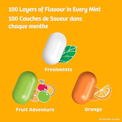 - SATISFYING MINTS: Each pill in this pack TIC TAC Fruit Adventure mints has 100 layers of satisfying fruit-filled flavour., TIC TAC FRUIT ADVENTURE: Enjoy TIC TAC mints infused with an explosive fruity taste to enjoy in every mint., FULL OF FRUIT FLAVOUR: Each flavoured pill is ready to give much-needed, satisfying taste in any moment. Enjoy them as after-dinner mints or share with friends., MINTS ON-THE-GO: The portable pack fits perfectly in your pocket or purse and great for on-the-go sharing and refreshment, like mints for after coffee., TRY EVERY FLAVOUR: TIC TAC is an epic brand of beloved mints. From minty to fruity flavours, you have a variety to choose from.