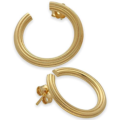- Recycled 925 Sterling Silver gold-plated women's earrings – minimalist textured striped hoops, nickel-free and hypoallergenic for sensitive ears, lovingly handcrafted with attention to detail, Hypoallergenic and nickel-free for sensitive skin – these hoops in genuine 925 Sterling Silver give you a timeless natural look with lasting value and durability, Distinctive textured striped design – 20mm (0.79") width, 2.2g per earring – small hoops that make your ears appear more delicate – the stripes create characteristic depth and visual interest, Sustainable gift packaging made from recycled materials – elegantly arranged in a stylish gift box with a velvet pouch and paper bag. A special gift for any occasion., From a Greek workshop with over 25 years of experience – each piece of jewelry is handcrafted by Emmanuela Alevizopoulou in Greece. Every creation carries a touch of Greek cultural heritage within it.