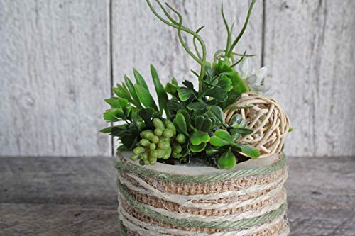 Rondin en bois rustique chic recouvert de corde verte crème et jute, Décor bureau plantes vertes artificielles succulentes, Centre de table, Faux succulents arrangement and greenery, Artificials greens plants & succulents in wood log, Single wood cedar log centerpiece decor, Wooden desk decor, Mini centerpiece
