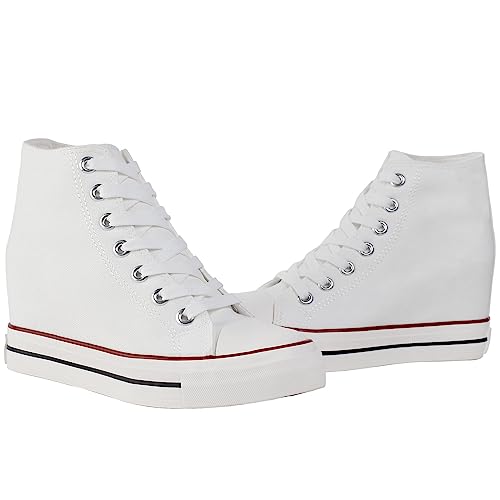 sekesin Women Girls Hidden Wedge Canvas Shoes High-Top Sneakers Platforms Heels Trainers Lace up Casual Ankle Boots(White,8 B(M) US-Label 39)