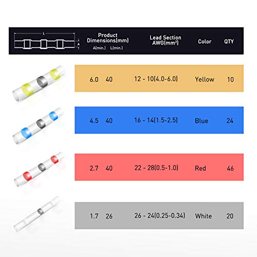 - Easy to identify and operate - Different colors correspond to different sizes, easy to pick up for use. Transparent sleeve provides precise inspection when strip and insert wires inside., More Effective Way -1 Step solder and seal process for all your connections,insulated and sealed., Waterproof:Unique double-wall design, external polyolefin pipe, built-in hot melt adhesive.When heated, the polyolefin tube shrinks in size and the adhesive flows through the insulation.Double wall tubing ensures watertight seal to prevent wire corrosion, No Slip Wire Contact - Tubing reduces in size and solder will melt and flow through the stripped wires, ensure strong holding --- your wire will never slip out of the connector. Can be ideal used in marine and automobile applications, Package include:50 pcs Solder Seal Wire Connector,23 pcs Red,12pcs Blue, 10pcs White, 5 pcsYellow