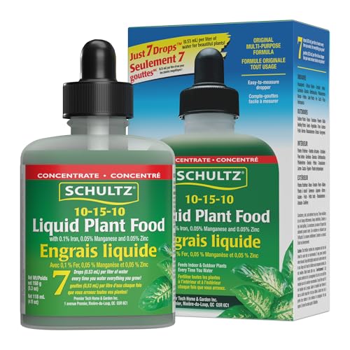 - Versatile Plant Fertilizer – Balanced 10-15-10 liquid plant food enriched with micronutrients; ideal for houseplants, flowers, herbs, and vegetables., Promotes Strong Growth – Encourages new growth, greener foliage, stronger roots, and more vibrant blooms in both indoor and outdoor plants., Easy-to-Use Dropper – Simple measuring system ensures precise feeding; just 7 drops per liter of water for effortless application., Concentrated Liquid Formula – Highly efficient plant fertilizer that lasts; one small bottle feeds a wide variety of plants., Trusted Gardening Brand – 118 ml bottle (150 g weight); Schultz plant food delivers consistent results for beginner and experienced gardeners alike.