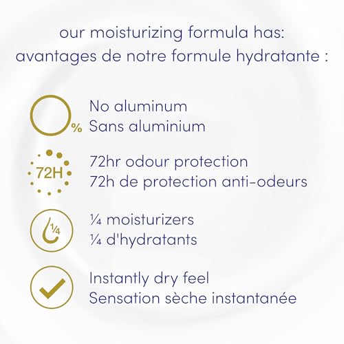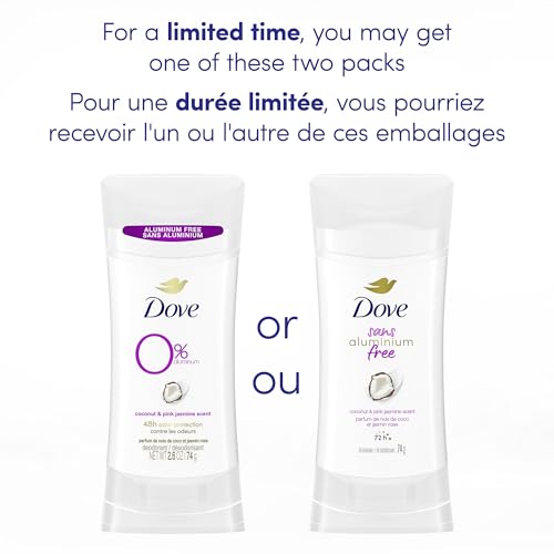 - EFFECTIVE PROTECTION, KIND TO SKIN: Dove aluminum free deodorant is kind to skin with no compromise on odour protection, FRESH SCENT: This women's deodorant with a delicate coconut and pink jasmine scent, provides 72-hour odour protection and long-lasting freshness., KIND TO SKIN: Deodorant for sensitive skin - free from aluminum, alcohol (ethanol) and baking soda., CARING FORMULA: care you can trust from Canada's #1 dermatologist-recommended brand, this deodorant is enriched with ¼ moisturizers., EASY TO APPLY: This deodorant glides on easily for a smooth application., CRUELTY-FREE: PETA approved vegan & cruelty free deodorant stick.