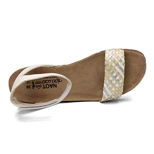 - Soft leather uppers with decorative woven design, Suede wrapped, anatomic cork and latex footbed molds to the shape of the foot, Adjustable hook and loop ankle strap, Low wedge heel on a flexible traction outsole