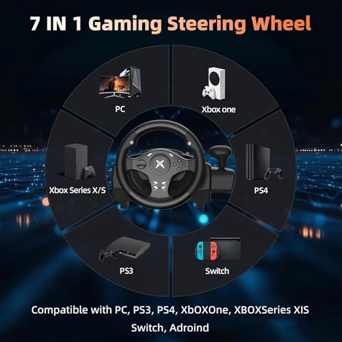 - 【Realistic Gaming Experience】The gaming steering wheel and pedals and shifter can be fixed on your desktop, and the suction cups of the pedals are also strong, which can be perfectly controlled even in extreme driving, bringing you a good driving experience. The game steering wheel is compatible with PS3, PS4, XBOXONE, XBOX360, PC, Nintendo Switch, Android and other systems (not suitable for Apple computers. The XBOXplatform requires a data cable to connect to the original handle)., 【Responsive Gear and Ergonomic Pedal Design】This ps4 steering wheel with pedals and seat is equipped with responsive gears and ergonomically designed pedals with progressive braking resistance and adjustable tilt angle. During the game, you can easily operate the steering wheel and feel every detail. It can bring you a better gaming experience., 【Easy to install and use】 Gaming steering wheel and pedals and shifter can be directly connected to the controller and console, compatible with most games. Comes with 2 clips to secure the steering wheel, perfect for racing gear and tracks, and also works on any flat surface. Its curved base allows it to rest on your lap., 【Dual Motor 270° Rotation】The Gaming Racing Wheel adopts integrated dual motor drive and 270° rotation design, with high sensitivity and good hand feeling. The steering wheel buttons can be adapted to the needs of different racing games, allowing you to experience the real racing fun., 【100% Satisfaction Guarantee】Please check product compatibility before purchasing. If you are not satisfied with the product or have any questions, please feel free to contact us. We offer you a money-back and satisfaction guarantee.