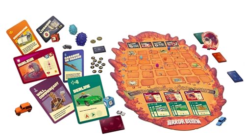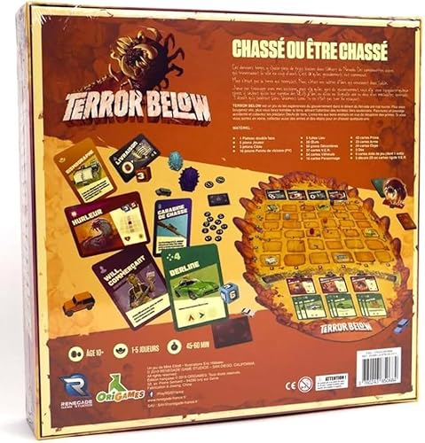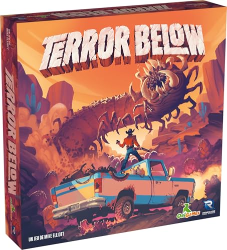 - SURVIVEZ À L’ATTAQUE DES VERS GÉANTS -- Terror Below est un jeu d’expériences gouvernementales qui se déroule dans le désert du Nevada. Plus vous bougez vite, plus vous faites de vibrations, attirant l’attention des vers vicieux sous terre, COLLECTEZ POUR RÉCUPÉRER DES PRIMES -- Naviguez sur ce terrain difficile pour collecter des œufs de vers précieux et les livrer à des endroits autour de la ville pour réclamer des primes. Si vous vous sentez chanceux, vous pouvez aussi recueillir des objets et des armes pour aller les chasser, L’HISTOIRE -- Pendant la partie, votre improbable groupe de héros parcourra les Lieux de la petite ville du désert pour trouver des primes, récupérer des armes et essayer de survivre en détournant l’attention des Vers, cette Terreur des Profondeurs. Ils finiront par attaquer et si vous vous trouvez sur leur chemin de destruction, vous avez intérêt à être prêt à vous battre, LE JEU -- Dans Terror Below, votre objectif est d’être le premier à marquer 20 Points de victoire. En fonction du Véhicule que jouez face à un Ver, vous aurez un certain nombre d’Actions à exécuter, CHOISISSEZ VOS ACTIONS -- Détourner son attention, se déplacer sur le plateau de jeu, ramasser des décombres pour les échanger contre des Armes ou des Objets de survie, ramasser un Œuf de Ver pour le livrer, puis combattre. Si votre personnage meurt, recrutez-en un autre, mais attention car vous n’en aurez que 3 au départ