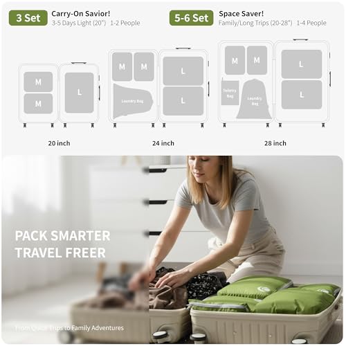 - Space Saver: Compression packing cubes via the exterior compression double zippers get more room in your luggage. Easy access to pulling out packed cubes from suitcase or backpack., Lightweight and Sturdy: We created the packing cubes set with Lightweight nylon fabric stands up to nonstop travel and the YKK zipper is reinforced with double stitching make this compression packing cube set extremely sturdy., Multiple Function: Water resistant nylon materials with odor control for sweaty and smelly clothes to provide piece of mind. No cross-contamination with other clothing. Different sizes travel packing organizers great for clothes, shoes, electronics, toiletries and more!, Smart organization: Different sizes of the packing cubes keep clothing, underwear, and accessories sorted. 5 and 6 set offer toiletary bag and laundry bag to meet your needs. Size : 25 x 18 cm (M), 36 x 25 cm (L) Compression range:10 cm - 4 cm / Laundry Bag Size : 46 x 34 cm/ Toiletary bag: 21 x 15 cm., Better Travel Gear: Compression cubes set keep your items organized for family breaks, business travel, hiking, camping, RV and cruise holidays. Compression packing cubes for travel is an useful travel accessory to stay organized and maximize space in your suitcase.
