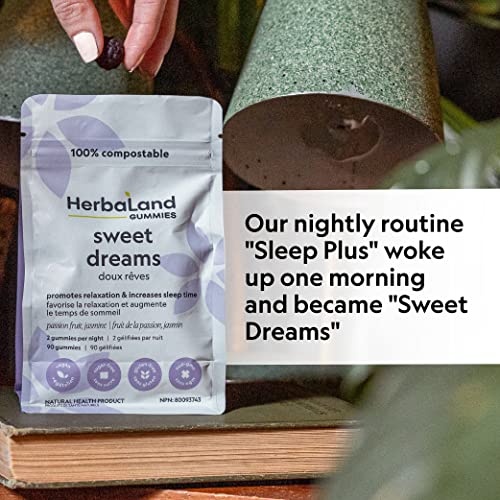 - With melatonin and l-theanine, our plant-based Sweet Dreams gummies support healthy sleep throughout the night!, Our Sweet Dreams gummies also include Vitamin B6 and organic Lemon Balm for a better sleep quality., Our gummies taste great and are easy to consume! These Passion Fruit and Jasmine-flavored gummies are a great way to cap the night., Sustainable - One of our core values is sustainability. By using compostable packaging and eco-forming technology to deposit our gummies into steel molds, this makes Herbaland one of the greenest manufacturers in Canada!, Health inclusive - All our vitamin gummy products are vegan, sugar-free, non-GMO, gluten-free, and proudly made in Canada!