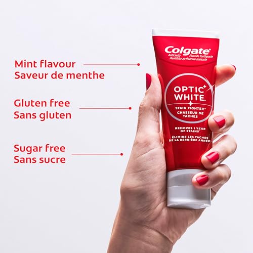 - One 90 mL tube of Colgate Optic White Stain Fighter Whitening Toothpaste, Stain Fighter is a stain removal toothpaste that fights stains and helps prevent new stains from forming, Removes 5X more surface stains* with micro-polishing action (*vs. ordinary non whitening toothpaste, after 2 weeks of continued use), This whitening toothpaste contains clinically proven technology to safely remove surface stains, Optic White Stain Fighter toothpaste provides teeth stain removal that’s enamel safe for daily use
