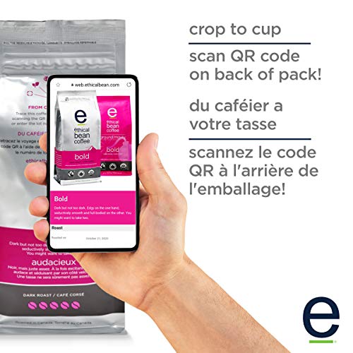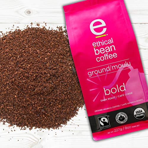 - One 8 oz bag of Ethical Bean Bold ground dark roast coffee, USDA organic coffee is grown free from harmful chemicals and pesticides, 100% Fairtrade certified coffee, 100% certified organic, 100% Arabica coffee, Trace this coffee's unique journey by scanning the QR code on each pack with our free app or enter the lot number into our website