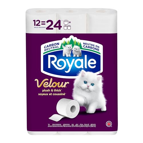 - Royale Velour bathroom tissue is now even softer. We've added more Velour softness to every roll for an elevated experience you’ve got to feel for yourself, Made in Canada with domestic and imported materials, Each roll of new Royale Velour Bath Tissues is just as strong and long as before, so you’ll have fewer rolls to change. And because this extra soft bathroom tissue is also carbon neutral*, it’s a natural choice for your home, Pack includes 12 rolls of 2-ply bathroom tissues with 142 Tissues per roll, 1704 Toilet tissue sheets in total, Royale Tissue Products are Carbon Neutral. Each year, forests we manage remove more carbon than is emitted in the lifecycle of Royale tissue products. The Royale brand is part of an organization that plants millions of trees annually in responsibly managed forests, with a billion trees planted since 1957 and counting.