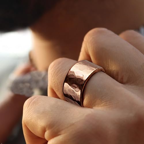 - [LAB-TESTED & CERTIFIED PURE COPPER RING] 8mm genuine hammered copper Band. Lab-tested and certified safe—free from harmful metals like lead, cadmium, nickel and PFAS. All-natural, uncoated, non-toxic coating, and skin-safe. A perfect authentic well-being copper jewelry gift for yourself or loved ones: birthday, anniversary, or holiday., [PROUDLY CRAFTED IN THE USA] Risk-free quality you can trust. Expertly crafted in the USA, Ivy & Bauble copper rings are certified for metal quality and safe for daily wear—a lasting symbol of style and authenticity., [PATINA IS NATURAL, NOT A DEFECT] Will it tarnish? Pure copper naturally develops a patina over time, giving each ring a unique, rustic charm. This natural aging process may cause a slight green tint on skin—a harmless and temporary reaction that wipes off easily. It is the HALLMARK OF AUTHENTIC, UNTREATED COPPER, and can be restored to its original shine with salt and lemon juice if desired., [EASY CARE & SHINE RESTORATION] Restore the original luster of your copper ring by gently soaking in lemon juice and water, or by rubbing the ring with a mixture of lemon juice and salt, then rinsing well. Dry completely and store in the included jewelry pouch for long-lasting brilliance., [DURABILITY FOR EVERYDAY WEAR] Our copper rings are crafted for strength and comfort and are designed to withstand daily use. With proper care, they can last a lifetime—making them both a practical accessory and a meaningful keepsake.