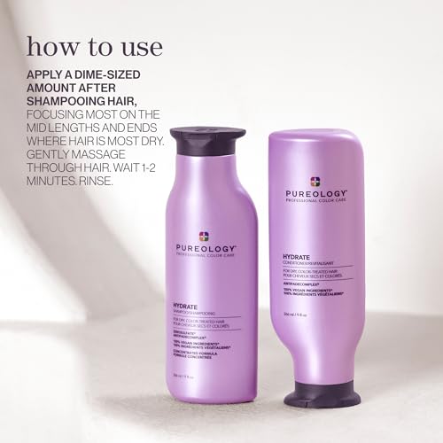 - Pureology Hydrate Conditioner is a nourishing, sulfate-free conditioner that is specially formulated to hydrate dry, colour-treated hair. Infused with natural ingredients, this lightweight formula moisturizes and detangles hair, leaving it feeling soft, smooth, and manageable., Formulated with Pureology's exclusive AntiFade Complex, Hydrate Conditioner helps protect your hair colour from fading, while also providing essential moisture to help prevent breakage and improve hair health. The conditioner's thirst-quenching formula provides superior moisture, and makes hair super soft. Safe for daily use., After shampooing your hair, apply a small amount of Hydrate Conditioner to your hair, focusing on the mid-lengths and ends. Distribute the conditioner evenly through your hair. Leave the conditioner on your hair for 1-2 minutes to allow it to penetrate and hydrate your hair. Rinse thoroughly.