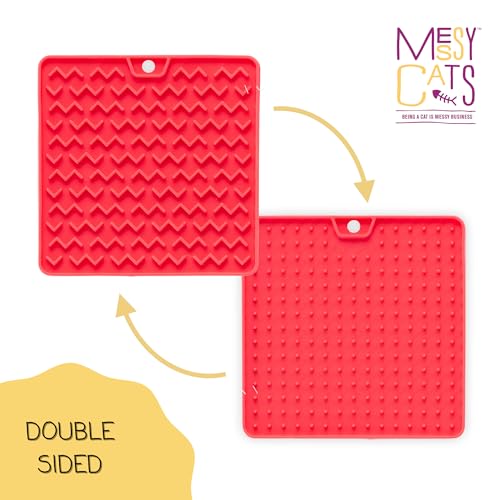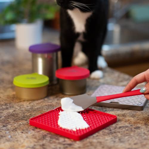 - SLOW FEEDER ALTERNATIVE – The groove design of this 5.5 x 5.5-inch square silicone mat will slow your pet’s intake of food while providing therapeutic benefit of licking. Spread kibble, wet food, soft treats, purees, supplements or any of your pet’s favorite treats on the mat and let their minds go to work. Mat works for all cats, puppies, and small dogs. Prolong enjoyment by freezing it before serving. Freezer and microwave safe., REDUCE BOREDOM & ANXIETY – As your pet works to get food off this mat, their minds will be stimulated, and they will be calmed and soothed by the promotion of licking. Perfect solution for stressful situations like bath time, vet visits, thunderstorms or fireworks. Licking mats also help distract from destructive behavior during separation or stressful times., REVERSIBLE DESIGN – Simply flip the mat over to reveal a new surface design to keep your pet stimulated with each meal or treat time. Get creative with this oven safe mat and bake your own tasty treats for your pet. Oven safe up to 460 degrees Fahrenheit., DENTAL HEALTH – Support your pet’s oral health with licking mats. The grooves and nubs help scrape the tongue, assisting with cleaning it. The licking action promotes saliva to keep gums and teeth healthy., DURABLE SILICONE – Made from flexible, durable, and food-grade safe silicone. Each stain resistant mat is BPA, PVC, and odor free. We only use the highest quality products because your pet’s safety is our priority. Dishwasher safe or wash with warm water and mild soap.