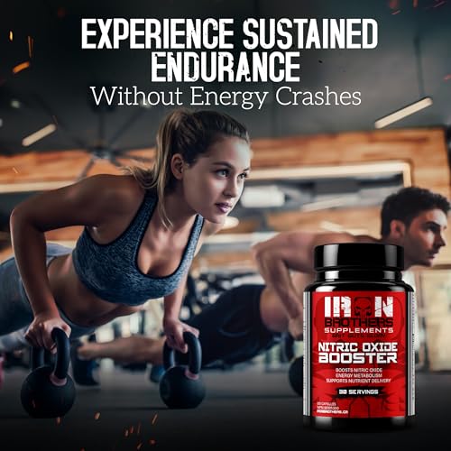 - Full, Energized Muscle Pump w/ Iron Brothers Nitric Oxide Supplement for Men & Women: Features a Quad-Action Nitric Oxide Formula with L-Arginine, L-Citrulline & Agmatine Sulfate to support a fuller muscle pump experience during workouts., Support Healthy Blood Flow & Circulation: Our nitric oxide for women is formulated with Pine Bark Extract, Niacin, and Piperine to support smooth circulation, efficient nutrient & oxygen support to active muscles—fueling your body during physical activity., Boost & Sustain Your Nitric Oxide Levels with a Double-Lock Formula: This blend combines Niacin to support healthy circulation, nitric oxide availability, and sustained blood flow, endurance, and performance during intense workouts., 100% Caffeine-Free, Stimulant-Free Composition: Our pre-workout nitric oxide booster for men is designed to support clean workout energy & endurance without jitters or crashes. Ideal for late-day training or stacking with other performance supplements., Vegan, Easy-To-Swallow Capsules with Maximum Absorption: What’s the point of a pump formula if your body can’t absorb it? Our nitric oxide capsules for men include black pepper extract to enhance nutrient uptake and absorb the key ingredients efficiently.