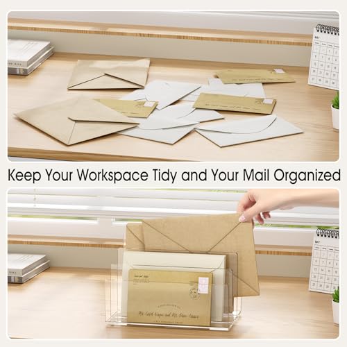 KTRIO 3 Section Mail Organizer Letter Holder for Desk, Vertical 3 Compartments Acrylic File Holder, File Sorter Desk Organizer for Envelopes and Electronics Office Supplies, Clear