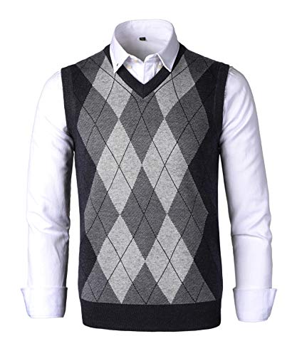 - HIGH QUALITY FABRIC - The knit sweater fabric is lightweight soft and well elastic, which provide excellent comfort and warmth. Soft hand-touch, warm, comfortable and durable. The soft fine knit wool blend is comfortable to wear., FEATURES - The knitted vests pullover featuring V-neck collar, sleeveless and fashional rhombus pattern decration, ribbed hem, mens argyle sweater vest, slim fit, contrast color, classic style, casual knitted pullover vests., Stylish Look: Wear it in combination with a shirt to complete your everyday office look or over a t-shirt to optimize your look in winters. The solid color and simplistic design makes the sweater vest versatile enough to be clubbed with every clothes in your wardrobe., Comfortable Fit: V-neck design can make it convenient to put on and remove. The loose fitting and the soft wool material feels weightless on your body yet provides efficient protection from cold., OCCASION - Mens v neck sweater pullover vest for a variety of occasions, such as office working, daily, sports, business, travel, party, banquet and other casual activities ect. Best choice for Spring, Autumn and Winter.
