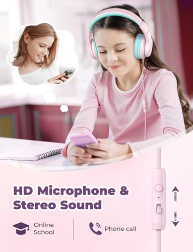 iClever HS19 Kids Headphones with Microphone, Volume Limiter 74/85dBA, Sharing Function Stereo Headphones for Kids Girls Boys, Foldable Over-Ear for Online School/iPad/Chromebooks, Pink
