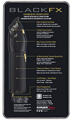 - Cord/cordless operation, High-torque brushless motor, Graphite blade (Replacement blade #FX803B), Lithium ion battery (2-hour runtime), 5-detent taper control