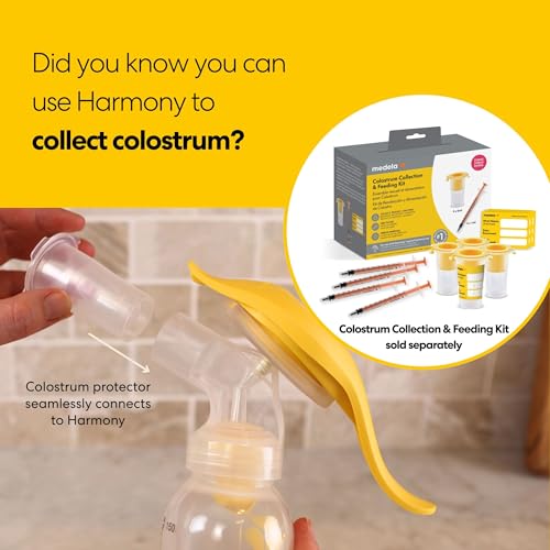 - #1 Best Selling Manual Breast Pump for a Reason: Great for busy moms, serving as a convenient alternative to an electric pump or for occasional use, More Milk in Less Time: Clinically proven breast shield technology delivers 11.8% more milk in less time., Lightweight & Portable: Small enough to fit into a handbag without the need for batteries, cables, or tubing. Easy to assemble with less parts to clean., Pump & Store: No crying over spilled milk. Collect milk directly into the bottle, twist on the cap and pop in the fridge., 2-Phase Expression Technology: Comfortable handle features stimulation and expression modes that mimics your baby’s natural sucking rhythms., Includes: (1) Medela Harmony pump with handle; (1) diaphragm set (stem & O-ring); (1) connector & valve; (2) membranes; (1) Flex shield (M); (1) 150 ml bottle with lid; (1) stand; (1) instruction manual