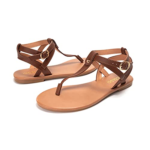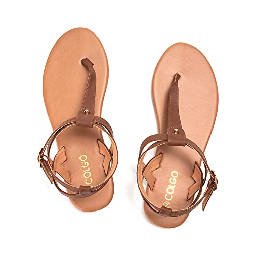 Colgo Thong Flat Sandals, Casual Women T-Strap Dress Sandals with Adjustable Ankle Buckle for Summer Wedding, Brown/Sdl, 10