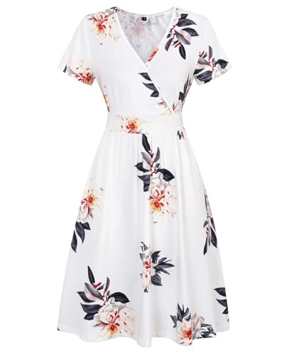- Material: Made of polyester and spandex, this flowy midi dress is soft, stretchy and lightweight, so breathable and comfortable for your skin, Feature: Sexy deep v-neck, short sleeve wrap dress, knee length dress with pockets, casual solid midi dress, empire waist pattern dress, floral party dresses for women, womens sun dress, this cute fit and flare dress makes you fashionable and charming, Highlight: This wrap deep v-neck dress, vibrant and sexy, is enable to show your elegant neckline and easily to match your favorite jewelry. The a-line dress with pleated design on the waist is flattering and these dresses that hide belly fat can shape your slim figure, Occasion: This knee length summer dress with pocket can be worn casually or in a formal setting,such as vacation, work, office, church, date and party. Short sleeve dress for wedding guest is perfect for spring and summer, you also can pair with heels, boots or a belt for a more chic and stylish look, Tips: Hand wash,or low temperature for machine washing, and hang to dry. Please read the size chart before ordering this v neck sundress with sleeves