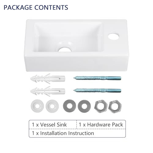 - SPACE-SAVING DESIGN: Modern, sleek wall-hung bathroom sink perfect for small bathrooms, powder rooms, or cloakrooms. Maximizes floor space with its compact, floating installation., PREMIUM CERAMIC QUALITY: Crafted from high-grade ceramic with low water absorption and acid resistance. Features a smooth, polished, stain-resistant surface for effortless maintenance and lasting beauty., EASY TO CLEAN SURFACE: Durable, non-porous ceramic allows for quick and easy cleaning from every angle – inside, outside, and underneath the basin., COMPACT DIMENSIONS: Measures 14.57" L x 7" W x 3.54" H (37cm L x 18cm W x 9cm H). Ideal rectangle corner sink solution for tiny bathrooms and tight spaces, WALL-MOUNT INSTALLATION (HARDWARE ONLY): Single faucet hole (right/left side, no overflow). Sink & mounting hardware included. *Faucet (for 1.37" hole) and pop-up drain (for 1.75" hole) must be purchased separately, DESIGN ÉCONOME EN ESPACE: Lavabo mural moderne et élégant, parfait pour les petites salles de bains, toilettes ou vestiaires. Maximise l'espace au sol grâce à son installation compacte et flottante., QUALITÉ CÉRAMIQUE SUPÉRIEURE: Fabriqué en céramique haut de gamme à faible absorption d'eau et résistante aux acides. Surface lisse, polie et résistante aux taches pour un entretien facile et une beauté durable, FACILE À NETTOYER: Céramique durable et non poreuse permettant un nettoyage rapide et facile sous tous les angles – intérieur, extérieur et même sous le lavabo, DIMENSIONS COMPACTES: Mesure 37 cm (L) x 18 cm (l) x 9 cm (H). Solution idéale de lavabo rectangulaire d'angle pour les très petites salles de bains et espaces restreints, INSTALLATION MURALE (SEULS ACCESSOIRES INCLUS): Trou unique pour robinet (côté droit/gauche, sans trop-plein). Lavabo et accessoires de montage inclus. Robinet (pour trou de 35 mm) et bonde à panier (pour trou de 44 mm) doivent être achetés séparément