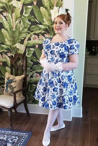 OBBUE Women's Square Neck Dress Vintage 1950s Cocktail Party Dress with Puff Sleeves, Blue White Porcelain, Small