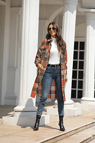 Omoone Women's Thick Woolen Lapel Button Up Long Plaid Shirt Coat Check Maxi Shacket, Orange Red, X-Large