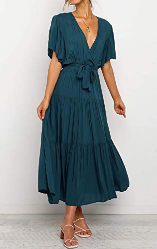 R.Vivimos Summer Dress for Women Cotton Ruffle Short Sleeves V Neck Casual Flowy Midi Dress with Belt (Small, Teal-Shortsleeve)