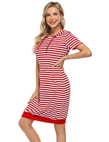 MISSKY Women's Pullover Hoodie Kangaroo Pocket Sweatshirt Casual Hooded Dress, Red&white1#, Medium