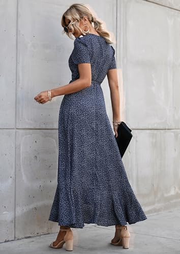 PRETTYGARDEN Women's Summer Wrap Maxi Dress Casual Boho Floral V Neck Short Sleeve Ruffle Hem Split Beach Long Dresses (Blue,X-Large)