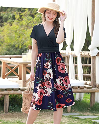 STYLEWORD Womens Mother's Day Summer Dresses Short Sleeve V-Neck Floral Wrap Waist Casual Dress with Pockets(floral01,L)