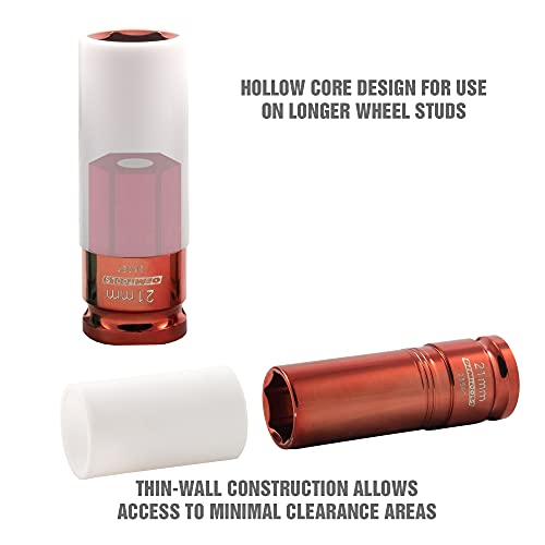 - Lug Nut Remover: Features a non-marring outer sleeve and insert to protect high-polished wheels and lug nuts from damage during removal; Can be used with hand or impact tools, Non-Marring Metric Sockets: Leaves no scratches or signs of wear on bolt tops, wheel rims, or lug nuts; Perfect for factory and aftermarket painted, clear-coated, or chrome bolts, Ideal Design: The hollow core design is for use on longer wheel studs; Thin walled socket construction allows access to minimal clearance areas; 6 point socket offers a firm grip, Easy Socket Identification: The size of the socket is clearly marked on its side; The socket is color-coded for increased visibility in tool boxes, Heavy Duty 6 Point Socket: This metric socket features a durable nylon outer sleeve and CR-MO steel construction for long-lasting strength and durability; Maximum torque: 500 foot pounds