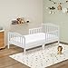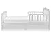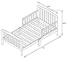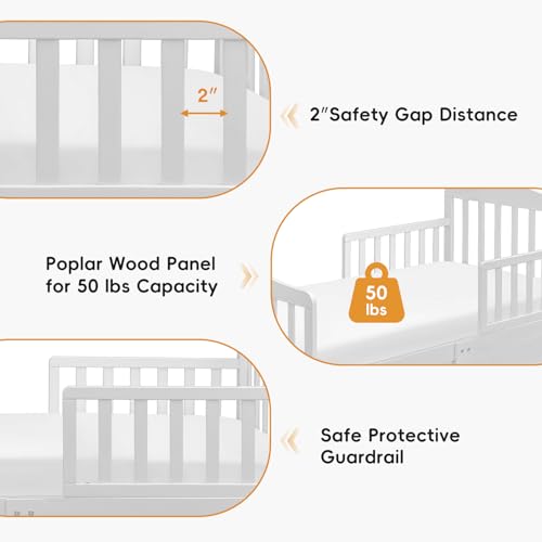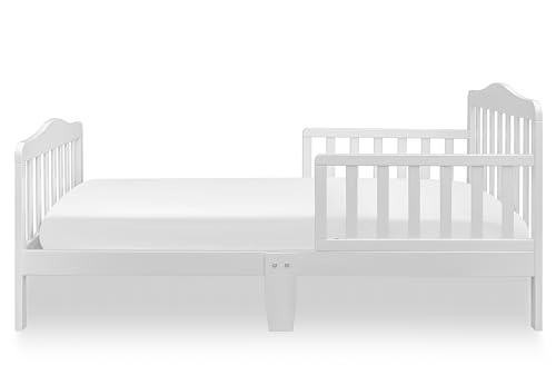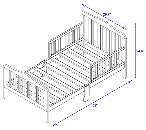 - Perfectly sized for toddlers, with low-to-the-ground design for easy access and added safety. The dimensions are 53 L X 28 W X 30 H inches and it weighs 16.5 lbs., Sturdy wooden frame supports up to 50 pounds and ensures long-lasting durability, features two side safety rails, Smooth, rounded edges and non-toxic finishes for a safe sleep environment tested for Canadian Market, Fits standard crib mattress (mattress not included) for an easy transition from crib to bed, Simple assembly with included tools and step-by-step instructions